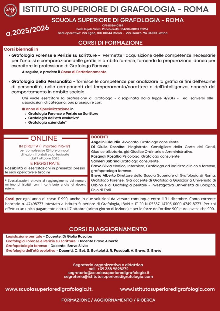 Iscrizione tramite mail indirizzata a scuolasuperioregrafologia@gmail.com